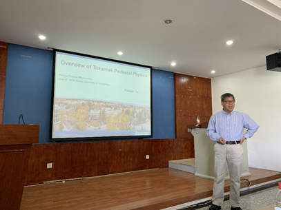 2019年6月26-28号,应PSI-APD课题组王德真教授邀请,国际著名理论等离子体物理学家、美国劳伦斯里弗莫尔国家实验室终身科学家徐学桥博士来课题组访问。27日,物理学院党委书记王正汹教授为徐学桥博士颁发了王大珩讲坛70周年校庆讲座纪念奖章,随后徐学桥博士做了题目为 “Boundary Plasma Physics and Plasma Material Interactions for Fusion Plasmas: Fundamentals and Applications” 的学术讲座。讲座分为两部分,第一部分是托卡马克中台基区物理的介绍以及边界局域模相关理论;第二部分是刮削层物理过程介绍,并重点阐述了刮削层输运以及偏滤器热流物理。访问期间,徐学桥博士与课题组人员就BOUT++程序开发、使用,学生培养和边界物理问题处理做了深入交流,并一致认为今后将开展更广泛和深入合作。