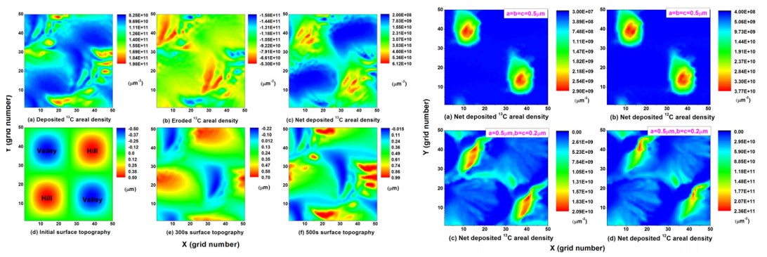 4. 采用了经验公式耦合在等离子体程序中实时计算等离子体变化过程中器壁材料的侵蚀(物理和化学侵蚀);自主开发了分子动力学程序研究粒子入射到碳钨中的入射深度、反射等行为;开发了动力学蒙特程序从较大尺度研究材料的侵蚀行为;开发了热传导模型研究入射到偏滤器靶板的热流对偏滤器的热腐蚀效应;开发了SURO程序研究等离子体与粗糙器壁相互作用。