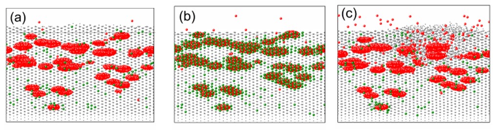 3. 基于分子动力学和动理学蒙特卡洛方法,利用LAMMPS等程序,研究强流高能等离子体辐照下,钨材料中气泡演化以及绒毛生长的行为。